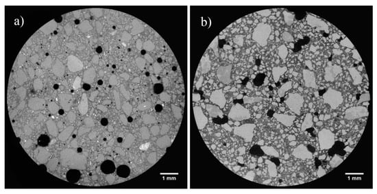 Air voids might affect the results of cement-based samples (CIQ and CIM, Figure 1 and Figure 8). They display very similar total porosity values measured using MIP and µCT. With regards to MIP analysis, these samples showed that most of their pore sizes were under 1 µm, under the detection limit of µCT; µCT measured air voids that were visually confirmed in the images. Such large air voids are probably connected by submicron throats, which are measured by MIP. Hence, a strong deviation in the measurements occurred, which could be explained by two effects: the total porosity measured by MIP mainly represents the porosity related to the air voids, and the pore size distribution provides a partial deceptive image of the actual pore size volumes. As an alternative, the air voids are inaccessible to mercury because of the small size of the pore connections, or of the ink bottle effect, or because of the presence of closed pores, as observed in previous work [].