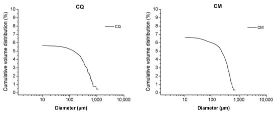 The cumulative porosity distributions of samples CQ and CM, both containing lime binder, are shown in Figure 9. The total porosity percentage was similar (5.6% and 6%, respectively) and confirmed the similar trend observed for mortars with the same binder.