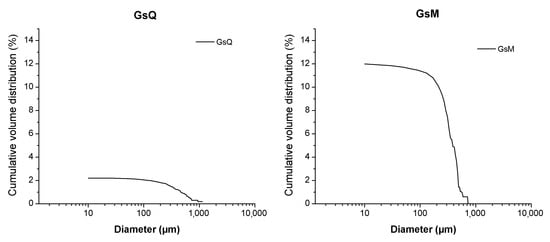 In Figure 10 and Table 3 the differences in the porosity of samples GsQ and GsM (gypsum with quartz and crushed limestone aggregate, respectively) are highlighted. Although they were prepared with the same binder (gypsum), there was an evident difference in the cumulative porosity distribution, which could be explained by the different aggregates present in the mixtures or in some differences in the mortar setting, even if the same environmental conditions and the same mixing procedure were adopted.