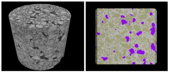 Example of the 3D visualization of sample NM. On the left, the gray scale reconstruction cylinder is visible. On the right, a section of the cylinder in false color is shown. The pores (violet), aggregate (light brown) and the binder (white) are highlighted. (For interpretation of the references to color in this figure the reader is referred to the web version of this article).