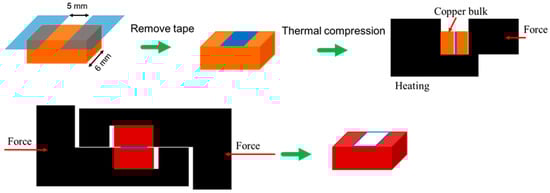 - The shear strength measurement was conducted as follows: The surfaces of the polished copper blocks were cleaned with acetone, 25 wt% citric acid solution, DI water, and ethanol. The two sides of the copper blocks were taped with two layers of 3M Scotch 810 tape. Paste PM03 was transferred to the copper blocks and the thickness of the paste was fixed with blade coating. The 3M Scotch 810 tape was removed. Two copper blocks were put together and bonded using thermal compression. Then, the shear strength was measured using a shear strength testing machine. The thermal compression and shear strength test of the sintering Ag paste are shown in Figure 1.