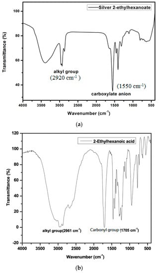 - Fourier transform infrared spectroscopy (FTIR) analysis of silver 2-ethylhexanoate was performed on a JASCO FT/IR 4600 spectrometer with a KBr pellet.