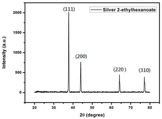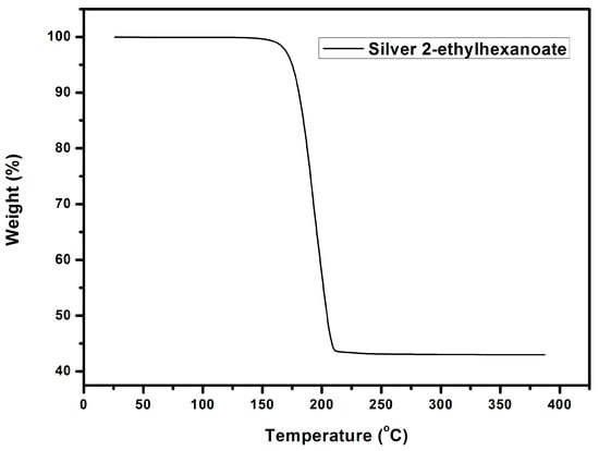 The silver 2-ethylhexanoate was synthesized from the reaction of 2-ethylhexanoic acid and silver nitrate. 2-Ethylhexanoic acid solution in methanol was mixed with an aqueous solution of sodium hydroxide to form a mixed solution. Then, a solution of silver nitrate was added to the mixed solution to form a silver precursor. The product was characterized by FTIR as shown in Figure 4a. The absorption peak of the carboxylate anion in the silver 2-ethylhexanoate appeared between 1610–1550 cm−1. The absorption peak of the alkyl group was observed at around 2920 cm−1. Compared to the FTIR spectrum of 2-ethylhexanoic acid (Figure 4b), we can see that the absorption peak of the carbonyl group (1705 cm−1) in 2-ethylhexanoic acid shifted to 1550 cm−1 when it was converted to silver 2-ethylhexanoate. That proves the formation of the silver salt. From TGA analysis (Figure 5), the decomposition temperature of silver 2-ethylhexanoate started at 150 °C, and the maximum decomposition rate was at 183 °C. After decomposing completely, a 56.7% thermogravimetric loss is formed, which is in full compliance with the ratio of the 2-ethylhexyl acid group and silver in 2-ethylhexanoate. After heating at 250 °C for 30 min, the silver 2-ethylhexanoate was converted to silver as shown in the XRD pattern (Figure 6).
