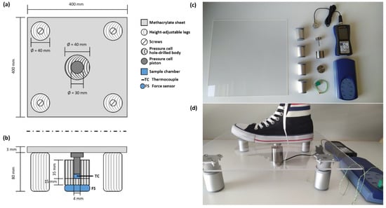 The barocaloric scale has been designed with low-cost and, mainly, off-the-shelf components (see Figure 1). The structural part consists of a methacrylate sheet (400 × 400 × 3 mm) and four height-adjustable legs (height: 60–80 mm) screwed on the corners of the sheet. The pressure-cell containing the barocaloric material is a homemade stainless-steel vessel consisting of a hole-drilled body and a piston (see Figure 1), which is located in the middle of the methacrylate sheet. The cell body is divided into two parts: (1) a stainless-steel solid base of 40 mm of diameter and 15 mm of height that is screwed to (2) a hole-drilled cylinder of 40 mm of diameter and 35 mm of height, where the drilled hole is situated in the middle of the cylinder with a diameter of 4 mm and a height of 35 mm. Here, the sample (around 10 mg) is placed inside the drilled hole on top of the solid base (see Figure 1b). A piston of 4 mm of diameter and 35 mm of height is placed inside the drilled hole on top of the sample. This piston counts with a wider head of 300 mm of diameter and 10 mm of height to facilitate the contact with the methacrylate sheet and the force transmission of the footstep. The force of the footstep is measured using a 2 kN button-shaped compression load cell connected to a PCE-DFG N dynamometer (PCE Iberica, Tobarra, Spain) and placed underneath the homemade pressure cell. The temperature of the sample was monitored using a K-type thermocouple of 0.2 mm of diameter connected to a Picolog TC-08 data logger (Pico Technology, St. Neots, UK). The thermocouple was placed in the middle of the sample through a wall bushing located in the side of the homemade pressure cell (see Figure 1b). Figure 1c,d show photographs of the actual elements and device assembling used for the barocaloric scale. As previously mentioned, this barocaloric device was simple and inexpensive with a total cost (including all the components, the homemade pressure cell, the dynamometer, and the temperature data logger) of 1700 €, which can be easily within the budget of the most modest academic and/or school laboratories.