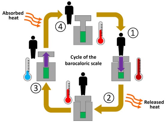 The barocaloric scale is designed to study the barocaloric cycle of pressure-induced heating and cooling by using the force of the footstep as pressure source. In a simple and general way, a conventional barocaloric cycle consists of the following four steps (see Figure 2): (1) when pressure is applied to a barocaloric material, the material increases its temperature, (2) by maintaining the applied pressure, the barocaloric material releases the generated heat, and its temperature decreases back to its initial state, (3) by releasing the applied pressure, the barocaloric material further decreases its temperature below the initial state, and (4) by maintaining the pressure released, the material absorbs heat from the environment and increases its temperature up to its initial value. Here, the released heat could be used to warm-up a given space in a heating process, and/or the heat absorption could be used to remove heat from a given place in a cooling process [].