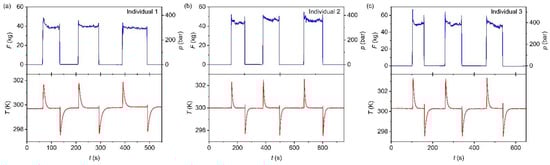 Selected curves of force and pressure (blue curves) and temperature (red curves) as a function of the cyclic footsteps of individual (a) 1, (b) 2, and (c) 3 with a bodyweight of 61.8 kg, 71.9 kg, and 85.0 kg, respectively.