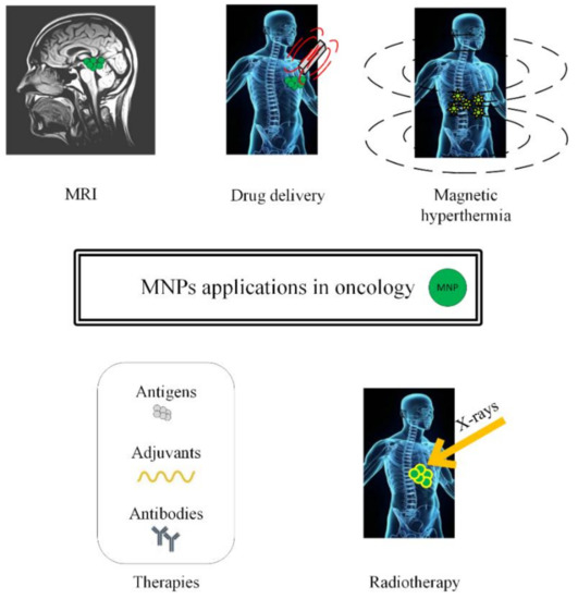 Schematic representation of magnetic nanoparticles’ applications in oncology (MRI investigations, drug delivery in chemotherapy, magnetic hyperthermia, immunotherapy and radiotherapy).