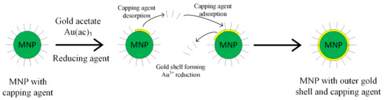 The gold shell can also be obtained through the indirect method, interposing a glue layer between the magnetic core and the gold outer shell, as presented in Figure 4 [52,53]. The gold shell must completely cover the magnetic core, in order to ensure a high chemical and physical stability. It has to contain a large number of chemical groups, such as poly-L-histidina, cross-linked polymer (cyclotriphosphazene-co-4, 4′-sulfonyldiphenol) (PZS), polyethylene-imine or silica that can chelate with metallic ions.