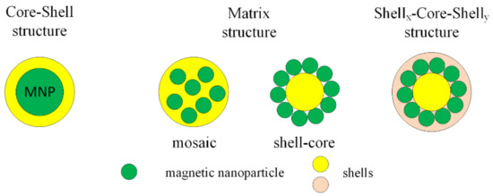 MNPs can be functionalized with organic compounds after or during the synthesis process. Organic functional materials present a good biocompatibility and biodegradability and do not have an important influence on the magnetic properties of MNPs. The functional groups are carboxyl, aldehyde, hydroxyl and amino, which, after the functionalization of MNPs with organic compounds, can be linked to deoxyribonucleic acid (DNA), proteins, enzymes or antibodies. After the functionalization process, the final structure is classified into three types: core–shell, matrix (mosaic or shell-core) and shellx–core–shelly (Figure 5).