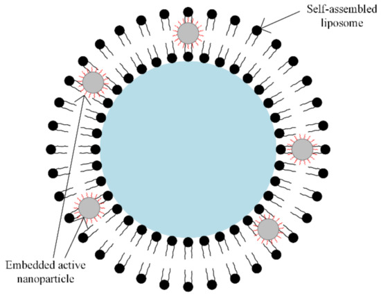 Self-assembled liposome combined with nanoparticles. Solid or water-soluble drugs can be included inside the core region (blue zone) and between interfaces (black spheres); embedded active nanoparticles or oil-soluble drugs in the lipid bilayer can be included.