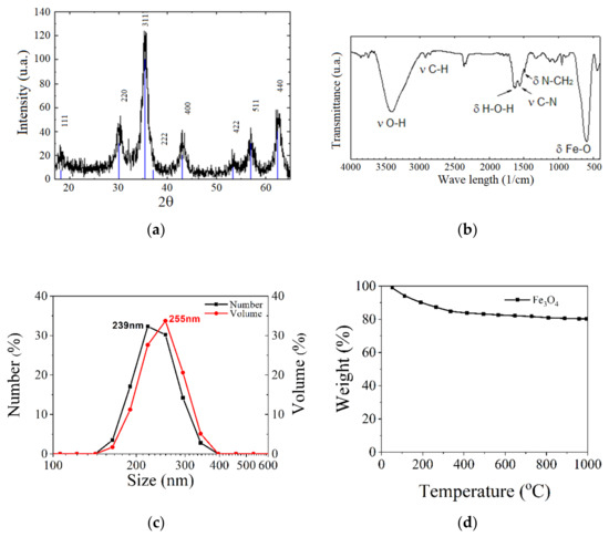 Different types of analysis made on Fe3O4 nanoparticles: (a) X-ray diffraction (XRD); (b) FTIR analysis; (c) DLS investigation; and (d) TGA analysis.