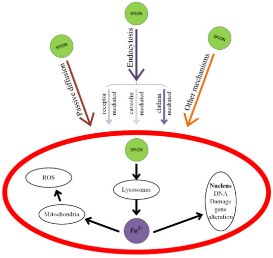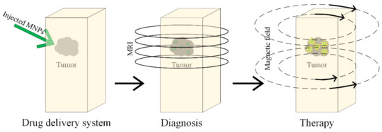 Magnetic-induced hyperthermia uses SPIONs to destroy the malignant tissues, which are difficult to treat through conventional therapies, and it will be detailed in Section 5. The tumoral tissues are targeted with SPIONs, whose magnetic properties are enhanced by using an external alternating magnetic field that induces a heating process in the neoplasm area. It is well known that by increasing the tissue temperature above 42 °C, the structural and functional proteins alter and the necrosis of the tumoral tissue begins.