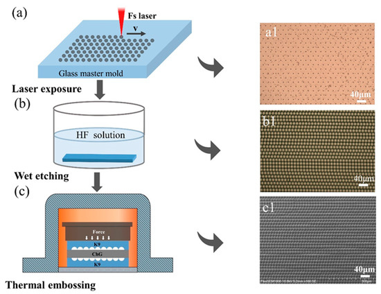 The ChG double-sided MLAs were fabricated in two steps, including a single-pulse femtosecond laser-assisted chemical etching and precision glass molding process, as shown in Figure 1. The mold can be used thousands of times without the need for repair, so the ChG MLA is manufactured starting with a hardened concave mold, which is made on a BK7 optical glass substrate by means of the efficient single-pulse femtosecond laser-assisted chemical etching technology [30,31]. An 800 nm femtosecond laser beam with a repetition rate of 1 kHz and a pulse width of 50 fs was focused by an objective lens (Nikon, Tokyo, Japan, NA = 0.5). A series of ablation craters in a v μm separation space was formed by continuous scanning at v mm/s (experimental conditions of 10 ≤ v < 40) and at a laser repetition frequency of 1 kHz (Figure 1(a,a1)). Then, the BK7 glass was ultrasonically cleaned in deionized water to remove the laser ablation ejecta. The irradiated BK7 glass was then treated with an 8% (w/v) hydrofluoric acid solution (HF) in an ultrasonic water bath (Figure 1b). After about 30 min of etching, a quasi-periodic arrangement of MLAs was produced on the surface of the BK7 glass (Figure 1(b1)).