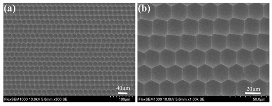 (a) Top-view SEM image of the quasi-periodic MLA and (b) a magnified SEM image of the quasi-periodic MLA.