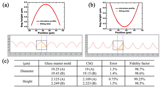 To characterize the cross-section of the prepared microstructures, laser scanning confocal microscopy was utilized. The microstructures were quasi-periodically arranged irregular microlenses with a size of 2 cm × 2 cm covering the whole area of the ChG. The profiles of the BK7 MLA and the ChG MLA are shown in Figure 5, respectively. To verify the uniformity of the microlenses, different areas of the ChG were measured, and the data were statistically processed and analyzed. The results show that the average diameter and sag height of the microlenses were 19 μm and 2.109 μm, respectively. In addition, according to measured and theoretical fitting data, the microlenses had a parabolic shape, as shown in the insets of Figure 5a,b. The focal length of the microlens can be calculated according to f = D2/8h (n − 1), where D and h are the diameter and sag height of the microlens, respectively, and n is the reflectivity of the material. According to the formula, the focal lengths of the ChG microlenses and the BK7 MLA were 13.4 μm and 43.59 μm, respectively. The deformation ratio was ≈1% (Figure 5c), demonstrating that this simple method could realize quasi-periodic MLAs on the surface of ChG with relatively high fidelity.