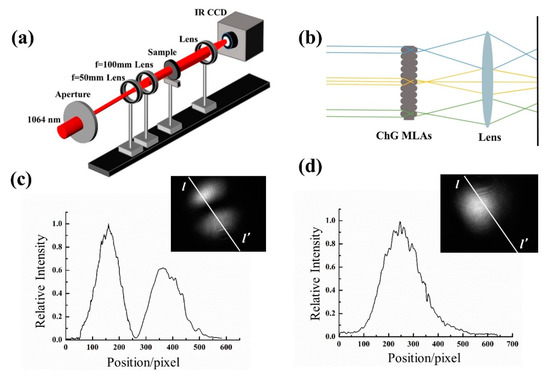 Beam homogenization is one of the most common applications for microlens arrays. Most microlens arrays are fabricated on polymer or plain glass, which are usually used for visible wavelengths. With a high transmittance for wavelengths, ranging from 1 to 11 µm, the ChG MLAs can be used for IR beam homogenization. The light beam homogenization was measured experimentally using the setup shown in Figure 8a. The light source was a semiconductor multimode laser with a wavelength of 1064 nm, and the output pattern was captured by an infrared CCD camera. As shown in Figure 8b, when the light passed through the ChG double-sided quasi-periodic MLA, the wavefront of the incident beam was divided into a series of wavelets, with each focal point of the microlens being a separate light source. The wavelets were then superimposed onto the screen by focusing, resulting in a uniform distribution of light intensity. The laser emitted a beam with a diameter of about 1 mm, and the incident laser was expanded to increase its diameter twice in order to allow the laser to cover more microlens units. The 1064 nm infrared semiconductor laser, which emits a multimode laser pattern as shown in the inset of Figure 8c, was shaped by the aperture and transformed into a single Gaussian beam (inset of Figure 8d).