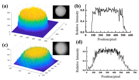 3D images (a,c) and cross-sections (b,d) of light intensity after the homogenization of the high-fluence pulsed femtosecond laser beam infrared light (multimode and Gaussian beam). Inset images are the illumination distribution of the laser beam after homogenization.