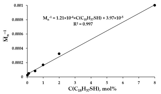 The presence of both the hydrophobic n-octadecylthio moiety and the hydrophilic residues of N-vinyl-2-pyrrolidone in the PVP-OD chain creates prerequisites for self-organization of the oligomers in aqueous solution and formation of nanosized aggregates. With an increase in the number average molecular weight of the hydrophilic fragment (achieved by decreasing the concentration of n-octadecyl mercaptan in the reaction system) the solubility of PVP-OD increases as expected, which is manifested in an increase in the critical aggregation concentration (CAC). For synthesized PVP-ODs, a linear dependence of the inversed number average molecular weight as a function of n-octadecyl mercaptan concentration C(C18H37SH) was observed (Figure 2). This is a consequence of the Mayo Equation (1) [35,36], written for the case of a constant monomer concentration in the experimental series.