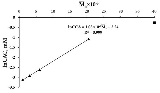 Interestingly, the linear dependence of the free energy of solvation of PVP-OD on the molecular weight of the hydrophilic fragment can only be observed for small , when the contribution of interactions between N-vinyl-2-pyrrolidone residues to the free energy of dissolution remains rather constant. For large , on the other hand, when the density of hydrophilic units inside the polymer coil increases [38] and the contribution of polymer-solvent interactions drops, deviations from the linear dependence are observed. The latter presumable also leads to a break in the linearity of the ln(CAC) dependence when the number average molecular weight exceeding 20 kDa. Therefore for PVP-OD, the transition from oligomers to polymers occurs in the range from 20 to 40 kDa (Figure 3).