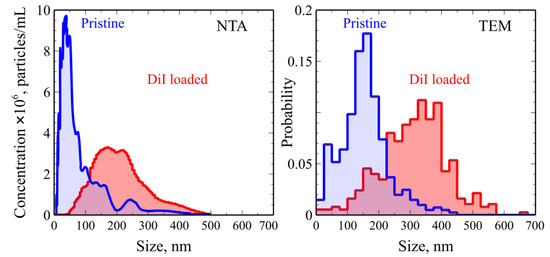 Nano-tracking analysis of PVP-OD aggregates with a number average molecular mass of = 6000 in water shows formation of aggregates with an average diameter of 105 nm and a mode of 37 nm was observed. Loading of DiI in the polymer aggregates led to an increase in their average diameter to 216 nm and the mode value to 172 nm, in line with the TEM observations (Figure 5), while maintaining the same average number of particles per frame in NTA measurements (44 and 41 for empty aggregates and the aggregates containing DiI, respectively). Thus, loading of DiI did not produce a strong effect on the number of nanoparticles in the system but rather led to an increase in their size. Interestingly, the size distribution changes upon DiI loading observed with NTA and TEM are very similar; however, there is a shift towards larger sizes in TEM. This can be explained by flattening of aggregates upon drying on the grid as well as the effect of the contrast media. A similar trend was observed for particles formed of PVP-OD with 1 kDa, 3 kDa and 12 kDa molecular mass. Therefore, it can be assumed that DiI is incorporated into the hydrophobic regions of aggregates formed by the octadecyl sections of amphiphilic PVP-OD, hence changing just the size of the aggregates and not their morphology. It should be noted that although number of works have addressed drug loading into nanosized aggregates based on amphiphilic PVP [22,23], the conservation of the overall morphology and the number of particles accompanied by an increase in their average size upon drug loading has not been shown earlier.