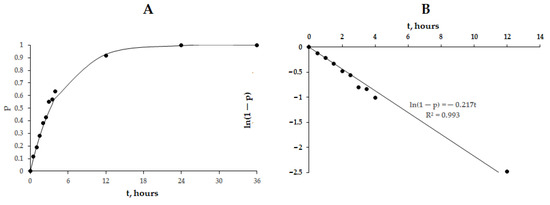 The release rate calculated by fitting Equation (4) to the experimental data plotted as vs. t yielded a value of 0.217 h−1 (0.0036 min−1), see Figure 6B.