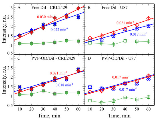 Figure 7 shows uptake curves for free DiI and DiI loaded into nanosized PVP-OD aggregates. The experiments were carried out using cell cultures of fibroblasts and glioblastoma cells with and without endocytose inhibitors. It should also be noted that within the studied time range of 60 min, the kinetic curves can be satisfactory approximated with linear dependences.