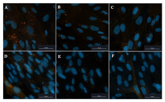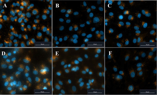 Composite fluorescence micrographs of CRL2429 fibroblasts after uptake of pure DiI (A—without inhibitors; B—in the presence of dynasore; C—in the presence of wortmannin) and DiI loaded nanocarriers (D—without inhibitors; E—in the presence of dynasore; F—in the presence of wortmannin). Cell nuclei are shown in blue as nucleic dye Hoechst 33258 was used. Orange color corresponds to the fluorescence at the DiI emission wavelength.