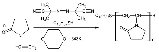 PVP-OD of different molecular weights was synthesized using a radical polymerization reaction of N-vinyl-2-pyrrolidone in a 1,4-dioxane solution at 343 K, initiated by azobisisobutyronitrile (AIBN) in the presence of octadecyl mercaptan (Scheme 1). N-vinyl-2-pyrrolidone and 1,4-dioxane were purchased from Sigma-Aldrich (St. Louis, MO, USA).