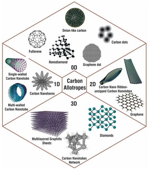 CNMs can be divided into 0D-CNMs (i.e., fullerenes, particulate diamonds, and carbon dots), 1D-CNMs (i.e., CNTs, Carbon Nanofibers (CNFs), and diamond nanorods), 2D-CNMs (i.e., graphene, graphite sheets, and diamond nanoplatelets), and 3D-CNMs. All decreased dimensionalities, including fullerenes, contain CNMs made completely of sp2-bonded graphitic carbon [12,13]. Figure 1 shows various types of carbon nanoallotropes. Table 1 shows various types of carbon nanoallotropes and their commercial application.