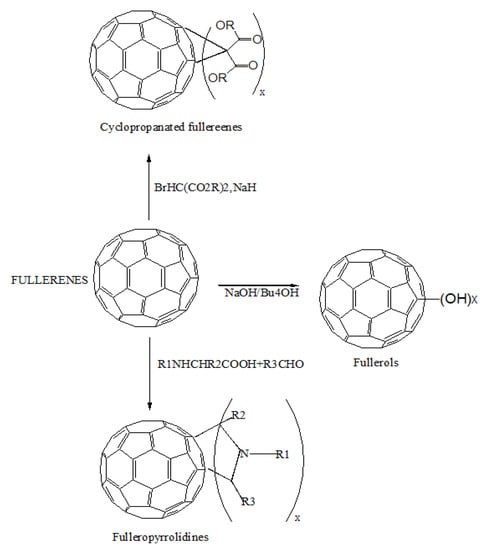 Buckminsterfullerene (C60) is the third carbon allotrope, discovered in 1985 by Curl, Kroto, and Smalley. Carbon atoms make up fullerene molecules, which are hollow spheres, ellipsoids, or tubes. The bucky shapes of spherical fullerenes are also known as buckyballs. The enormous curvature of these hollow spheres’ conjugated-electron systems enables rich chemical behavior, permitting the synthesis of a wide range of derivatives, making the fullerene family a useful building block. In medicinal chemistry, it is assumed that three-dimensionality, length, hydrophobicity, and electronic configurations make them an attractive topic. The peculiar configuration of their carbon cage, along with their enormous derivatization spectrum, makes them a possible therapeutic agent. Fullerenes are insoluble in nature; thus, their biological applications have drawn growing interest. The fullerene family, especially C60, offer attractive photographic, electrochemical, and physical properties that can be used in several medical fields [27]. Fullerene derivatives have been characterized as inhibitors of human immunodeficiency virus (HIV) [28], contrast agents for magnetic resonance imaging [29], antioxidants [30], and anti-bacterial agents [31]. They are also useful as targeting vectors to mineralized bone [32] and sensitizers for photodynamic therapy [33]. The vast variety of carbon atoms utilized to make fullerenes, the diversified array of moieties that may be hooked up to the surface of fullerene, and the numerous preparation techniques have resulted in a wide range of fullerene derivatives. Among all the types of fullerenes, C60 is widely used [34]. Fullerenes’ surfaces are extensively modified to make them water-dispersible, allowing them to be utilized in medicinal and dermatological applications. Of the other fullerene derivatives, C60 may be multi-functionalized, forms NP, and serves as a drug absorbent, making it an attractive scaffold for drug administration. Fullerenes can behave as drugs in a variety of functional ways [35]. Fullerenes can produce direct bioactivity, such as antioxidant activity, when surface-functionalized [27]. Both pure and modified fullerenes can penetrate into intracellular space or accumulate at the cell membrane due to their small size (less than 1 nm), posing a threat to cell functions and integrity [36]. In a broad spectrum of applications, pristine fullerenes showed neither acute nor subacute toxicity. However, due to the techniques used for solubilization, the physicochemical characteristics of fullerenes changed, resulting in ROS-related behavior and fullerene toxicity [37]. Figure 2 shows the common approaches, such as Bingel–Hirsch reactions for cyclopropanation, polyhydroxylated for the synthesis of the hydroxyl group with fullerenes, and Prato reactions for the cycloaddition of azomethine ylides to synthesize water-soluble fullerenes. These approaches can increase the solubility of fullerenes to 100 mg/mL [35]. Fullerene derivatives are also helpful in the sustained release of drugs. Fullerene derivatives covalently attached to drugs via a linker were tested for sustained release in lung cancer and were found to be more effective than the naive drug [35].