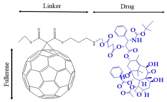 The functionalization of fullerenes and their conjugation with a drug using a linker.