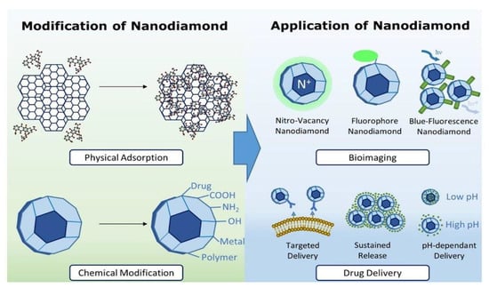 Nanodiamonds (NDs) are carbon nanoparticles that are typically around 2 to 8 nm in diameter, with a truncated octahedral architecture. Generally, the surface of nanodiamonds is coated with a layer of functional groups that stabilizes the particle by reducing dangling bonds. The conversion of sp3 hybridized carbon with sp2 also results in the increasing stability of the particles. Chains and graphitic patches are formed by the carbons in sp2. Oxygen-containing groups end the majority of surface atoms. Some nanodiamonds are faceted, whereas most have a rounded shape [38]. Synthetic diamonds and nanodiamonds are relatively affordable, despite their extremely high cost. Selective uses of nanodiamonds, on the other hand, may necessitate specific physicochemical characteristics, which may necessitate additional surface modifications with various functional groups. The continued study and recognition of the methods of disaggregation, physicochemical characteristics, surface modification, biocompatibility, fluorescence, and optical dispersion of NDs has developed broad perspectives for these biomedical applications [39]. Through their various properties, such as the ability to load high amounts of drugs and the ability to penetrate cellular membranes, NDs have shown tremendous potential to emerge as a medium for transporting drugs into biological systems. The innovative properties of this biomaterial have revolutionized various drug delivery systems and supported gene delivery vehicles in the identification of the biomolecular targets of drugs [40]. Investigation of the biocompatibility, biodistribution, and biological destiny of NDs and their conjugates is required for a therapeutically relevant strategy [41]. Figure 3 displays different methods used in the functionalization of NDs. These methods help to improve the physical properties of the materials and also lead to the acquisition of various other properties, such as targeted delivery, sustained release, and pH-mediated drug delivery. NDs have been widely used for bioimaging because of their excellent optical properties and their various sensing and therapeutic components.