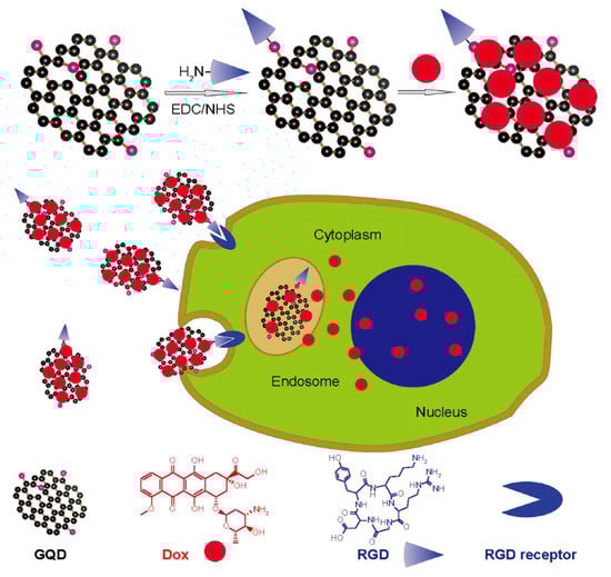 Schematic presentation of cancer cells being treated by multifunctional GDQs [51]. Abbreviations: eDc/Nhs, 1-(3-(dimethylamino) propyl)-3-ethyl carbodiimide and N-hydroxysuccinimide; GQD graphene quantum dot, Dox, doxorubicin; RGD, arginine glycine-aspartic acid. Copyright Dove Press, open access to scientific and medical research.
