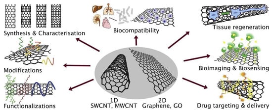 The surface functionalization of CNMs has been employed to improve their biodegradability, safety, and aqueous solubility. The functionalization of CNMs improves delivery efficiency through reduced clearance and prolonged retention in the body [7]. However, some research has shown that some methods of surface functionalization, such as cationic or anionic functionalization, may lead to higher toxicity compared to non-functionalized CNMs. Evidence has shown that the functionalization of CNMs creates a more dynamic material through the “tagging” of different drugs, peptides, nucleic acid, amino acids, and proteins on the surface of CNMs, which can enhance their efficiency, and solubility while reducing their toxicity [10,11]. Various interactions, such as covalent, ionic, Van der Waal or π–π, can be used to link different functionalizing agents and/or biologically active molecules to the CNMs [11]. These interactions help to graft the functional groups over the surface of CNMs and allow for strategic placement and functionalization at specific regions of the CNMs’ shape [12]. Because these modified CNMs feature various inherent properties, they are extensively used. Therefore, we conducted a review of CNMs, emphasizing the different types of CNM, their importance in drug delivery, and their role in biomedical applications.