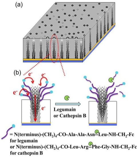 CNFs are synthesized via chemical vapor deposition, phase separation electrospinning, and templating [20]. Among these, electrospinning has steadily gained popularity as a low-cost and simple method of manufacturing nanofibers [68]. CNFs can be modified for biomedical applications with many different bioactive molecules [69]. Figure 6 demonstrates a nanoelectrode array-based electrochemical technique for detecting protease activity. With a ferrocene (Fc) moiety connected at the starting end, vertically aligned carbon nanofibers were covalently bonded with legumain and cathepsin B. Fc measured the signals and identified different distinct properties from carbon electrodes.