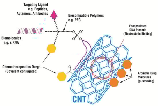 Until now, countless methods have been developed by many researchers to carry smaller compounds, such as chemotherapeutic anti-cancer drugs, on CNMs, either by using covalent conjugation or non-covalent adsorption. The design of CNM-based drug vehicles has also been led by theoretical modelling. Drugs are covalently conjugated with a nanocarrier and attached to functional groups on the CNM’s surface or coated with polymers on the CNM via cleavable bonds. Sahoo NG et al. [87] used folic acid (FA) to modify the surface of CNTs, which resulted in the enhanced suppression of tumor growth and minimized the side effects caused due to the DOX in the solution. The developed formulation with a modified surface of CNTs and with a high DOX loading capacity boosted anti-tumor efficacy in the in vitro study. This study offered better hope for the development of a promising therapy with lower systemic toxicity that might be utilized for tumor treatments in the future. Similarly, CNMs in conjugation with other anticancer drugs, such as docetaxel [88], tamoxifen [89], and oxaliplatin [90] have also shown encouraging results for the treatment of cancer in vitro, as well as in the in vivo study. Table 2 emphasizes different types of drug-loaded CNMs studied for the assessment of efficacy in vitro and in vivo against several diseases. Pei X et al. [91] demonstrated that anticancer drugs conjugated with PEGylated graphene oxide (GO) can be delivered to cancer cells in the cell culture. This study suggested that a novel delivery system could be used for the delivery of different aromatic, low-solubility drugs, which could support the development of better and more efficient treatments for cancer. In another in vitro study, PEGylated nano-GO loaded graphene oxide with DOX was formulated and showed it can be used as chemotherapy and photothermal therapy (PTT) for the treatment of cancer. In the safety assessment study, this delivery system did not show any cytotoxicity to the murine mammary tumor cell line EMT6 [92,93]. Figure 9 demonstrates several perspectives employing CNT-based drug delivery carrier systems. These approaches include the binding of the ligand at its particular site (such as the antibody, peptide etc) in disease, single-stranded biomolecules (such as siRNA, miRNA) or the coating of biocompatible polymers to provide intimacy in the living system (e.g., Polyethylene Glycol (PEG)), some drugs are chemically attached to the nanocarrier’s surface or PEG (e.g., chemotherapy drugs) and plasmid encapsulated by CNT that could be helpful in detection and imaging [94].