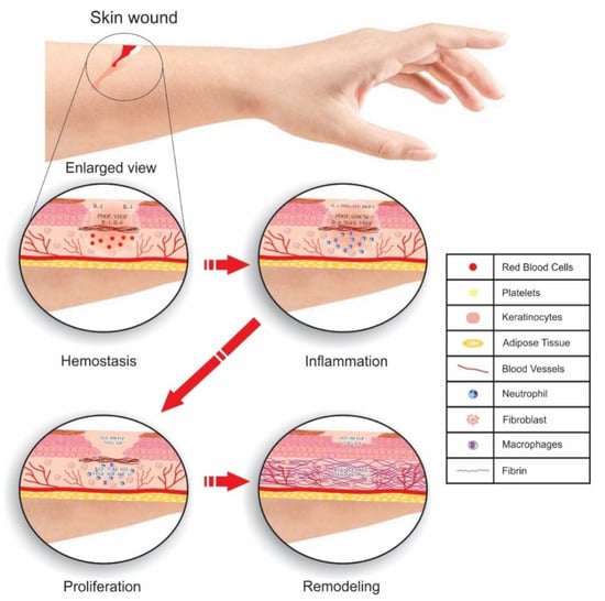 Wound healing is a distinct physiological process through which injured tissue is repaired within a short time. Uncoordinated wound healing is generally associated with many health problems, such as diabetes, extensive burns, and chronic wounds [137]. In wound healing, there are four coordinated and overlapping phases [138]. These phases must proceed in the correct sequence for proper healing [139]. Figure 10 indicates 4 evolutionarily conserved phases of wound healing in skin executed in a coordinated manner: hemostasis, inflammation, proliferation, and tissue remodeling. Multiple cell types (fibroblast, keratinocyte, endothelial cells etc.) and molecular events are involved in highly regulated ways by various growth factors, cytokines and chemokines [140].