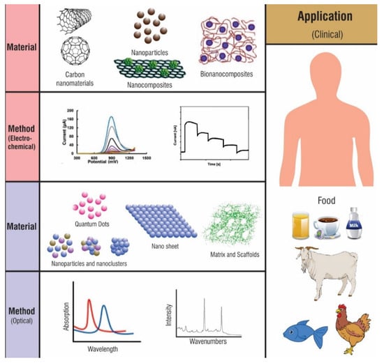 Biosensors are sensors whose analyte or recognition elements are of a biological nature. Thus, they can be used to track changes in biorecognition events in a diseased or abnormal condition [150]. In general, a biosensor is an element comprising a transducer producing a thermal, electrical, or optical output signal. In electrochemical biosensors, carbon materials have been used for decades [151,152]. Figure 11 shows different types of CNMs, of which two types of methods, electrochemical and optical, are most commonly used for biosensing platforms. In the electrochemical sensing platform, CNMs improved analytical performance due to the increase in electrochemically active surface area. In optical sensing platforms, CNMs are employed as fluorescence emitters and fluorescence quenchers due to changes in fluorescence intensity. CNMs offer a diverse set of uses in the clinical, agricultural, and food industries because of their simpler, portable, and less expensive disposable biosensors [153].