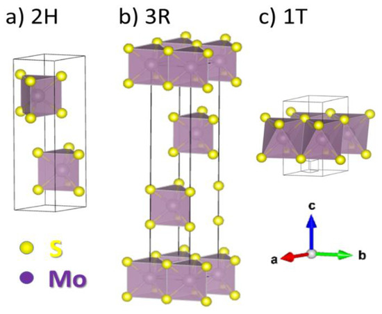 MoS2 belongs to a class of transition metal dichalcogenides (TMDCs). TMDCs share a common formula MeX2, where Me is a transition metal element from group four (Ti, Zr, Hf), five (V, Nb or Ta) or six (Mo, W), and X is a chalcogen (S, Se or Te). Their crystalline structure comprises an inner Me layer sandwiched by two X layers. Owing to two types of the Mo coordination and various arrangements of the S-Mo-S layers, there are three MoS2 polymorphs found in nature, with the 2H MoS2 structure being the most abundant (see Figure 1).