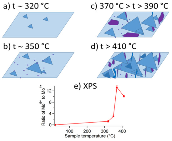 Phenomenological aspects of the MoOx formation onto MoS2 basal planes during their heating in dry air. (a) Above ca. 320 °C, triangular 1 ML deep etch pits were observed [33,34,35,40]. (b) Nucleated growth of the etch pits was supplemented by appearance of small sub-nm size MoOx clusters detected already at ca. 350 °C via a combination of various experimental techniques [47]. (c) At temperatures between 370 and 390 °C, the largest amounts of Mo oxides and their derivatives accumulate on the MoS2 surface [42]. Some of it forms irregular patches (marked in violet) [34,42]. (d) Above 410 °C, less oxide has been detected indirectly and locally via AFM techniques, as well as chemically and globally via XPS studies. In addition, in this regime, substantial surface defects have been observed. (e) Unpublished analysis based on the XPS results (from Reference [42]) collected on Si substrates with sparsely distributed and mechanically exfoliated 2H MoS2 flakes. It suggests the largest amount of the surface presents MoO3 oxides in the vicinity of 370 °C.