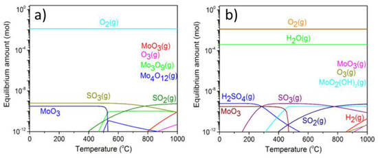 Smolik et al. reported experimental data and thermodynamical calculations on oxidation, volatilization and re-deposition of molybdenum oxide species formed from a certain molybdenum alloy heated between 400 and 800 °C in flowing dry and humid air [53]. Their conclusions agreed with the simulations of Walter et al., as well as their own simulations based on similar data as the ones of Walter et al. The Mo oxide species on Mo alloy underwent volatilization, which was dominated by the appearance of MoO3 above 550 °C and by the appearance of the MoO2(OH)2, formed from the small ingress of water vapor, at temperatures below 550 °C. All of these products were measured in the exhaust gases.