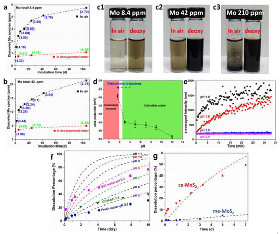 Thin and defected MoS2 nanosheets dissolve in water at room temperate above pH of 2 and below concentrations of 2 mM. Wang et al. [61] compared very defective liquid-exfoliated from powder (ce-MoS2) nanosheets with averaged lateral dimensions of 250 nm with less defective, ultrasonically exfoliated from powder (ue-MoS2) nanosheets. In both cases the edge effects played a crucial role due to small lateral dimensions of the nanosheets of 100–150 nm vs. several microns in typical mechanically exfoliated geological MoS2 flakes. Furthermore, the ce-MoS2 nanosheets aggregated visibly in water below pH of 1.9 and in concentration of Mo species of 210 ppm Mo (highest out of the three concentrations they prepared), which corresponded to 2.2 mM solution of Mo. In contrast, the ue-MoS2 nanosheets remained at least partially dissolved in all solutions (see Figure 4a–e).