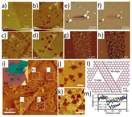Three seminal studies from 2013 detailing oxidative thermal etching onto basal planes of thin 2H MoS2 crystals with emphasis on the formed triangular etch pits. (a–d) Typical AFM height images showing growth of the equilateral triangular etch pits on a single MoS2 flake at sample temperatures of 325, 345, 355 and 365 °C, respectively (each heated for 2 h) [33]. (e–h) Simultaneous etching and thinning of 2L MoS2 nanosheet [34]. (e,f) Optical image of the flake before (e) and after (f) thermal annealing at 330 °C for 15 h. AFM height (g) and phase (h) images of the thinned MoS2 nanosheet. (i) AFM topography image of a thin MoS2 flake annealed at 320 °C for 3 h [35], (j,k) close-ups on two areas surrounded by dashed lines in the panel (i) and differing in the number of MoS2 monolayers: 1 L in (j) and 4 L in (k). They show alternating triangular etch pits between odd and even number of layers. (l) Schematic molecular structures of the suggested etch pits. The structure with Mo-edges exposed was suggested to be more stable. (m) Height profiles along the dashed lines passing through selected pits confirming their preferential depth of 1 MoS2 layer. Parts (a–d) are reprinted from Reference [33], with permission from Springer Nature Customer Service Centre GmbH: Springer Nature, Nano Research (2013); parts (e–h) are reprinted from Reference [34], with permission. Copyright ©2013 WILEY-VCH Verlag GmbH & Co. KGaA Weinheim. Parts (i–m) are reprinted in part from Reference [35], with permission. Copyright 2013 American Chemical Society.