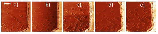 Growth of local triangular etch pits on thick MoS2 crystals due to their heating. AFM investigations as a function of heating time on ~30 nm thick single MoS2 flake. Scale bar 1 μm. For better visualization, only one-way LFM (∼friction) images are shown. Images from (a–e) were obtained after heating 10, 15, 20, 25 and 30 min at 370 °C, respectively. Reprinted from Reference [40], with permission. Copyright 2019 American Chemical Society.