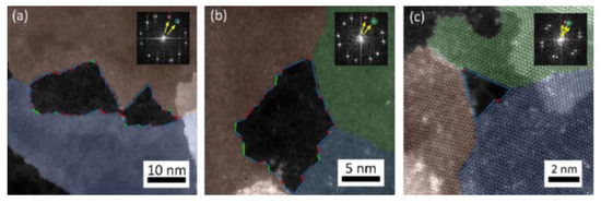 Etching on crystalline edges of the 2H MoS2 crystals. (a–c) ADF-STEM images of etched grain boundaries in as-grown MoS2 monolayers. The residual edges are marked with blue, red and green lines, representing zigzag (ZZ) Mo edges, ZZ S edges and ZZ S-Mo edges, respectively. Different grains are labelled by different colors, which are also marked with solid circles in the corresponding FFT patterns presented in insets. Reprinted from Reference [70], Copyright (2017), with permission from Elsevier.