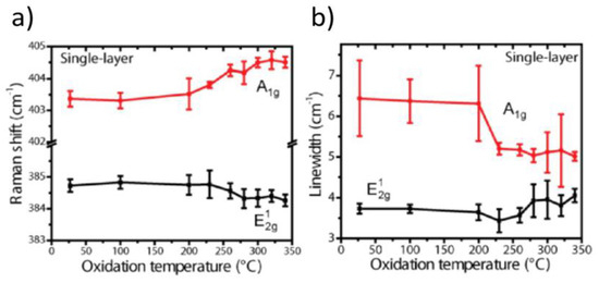 Raman studies of A1g and E12g bands on single-layer MoS2 as a function of heating temperature. (a) Raman shifts and (b) Linewidths of the investigated modes, respectively. Following the trend set by the behavior of the A1g mode, the authors of Reference [35] claimed to observe an electron density withdrawal from the MoS2 layer upon oxidative etching. Reprinted from Reference [35], with permission. Copyright 2013 American Chemical Society.