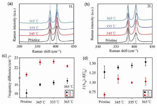 (a,b) Comparison of the Raman spectra of 1L and 2L MoS2 heated in air at different temperatures. (c,d) The corresponding frequency differences (frequency of the A1g mode minus frequency of the E12g mode) and intensity ratios (A1g mode to E12g mode) for 1L (black) and 2L (red) MoS2. Increasing ratio of the intensities in (d) corresponds to decreasing ratio of the linewidths. Reprinted by permission from Springer Nature Customer Service Centre GmbH: Springer Nature, Nano Research [33] (2013).