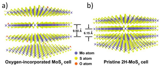 Structural models of (a) the oxygen-incorporated MoS2 with enlarged interlayer spacing and (b) the pristine 2H-MoS2. Reprinted from Reference [10], with permission. Copyright 2013 American Chemical Society.