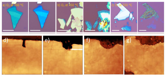 Substantial shrinking of the single MoS2 flakes after rapid thermal oxidation in air above 400 °C. (Color online) (a–c) Optical images of the before (left) and after (right) examples of oxidized flakes previously mechanically exfoliated on Si substrates and annealed in Ar to remove scotch tape contaminants, all flakes heated for 20 min at O2. (a) At 350 °C, not much etching/oxidation was observed. (b) At 450 °C. (c) At 550 °C. In each image, the darker regions of each flake are 5–10 layers of MoS2 (3.2–6.5 nm), which etch at similar rates. All scale bars are 10 µm. (d–g) 5 µm × 5 µm AFM LFM images (for better contrast) of a single ca. 20 nm–thick MoS2 flake on silica/silicon substrate [77]. The images were collected at room temperature after progressive heating of the sample in air at temperatures and times provided: (d) 370 °C at 10 min, (e) 400 °C at 5 min, (f) 410 °C at 5 min and (g) 420 °C at 5 min. Parts (a–c) are reprinted from Reference [36], with permission. Copyright 2017, American Vacuum Society; parts (d–g) are adapted from Reference [77].