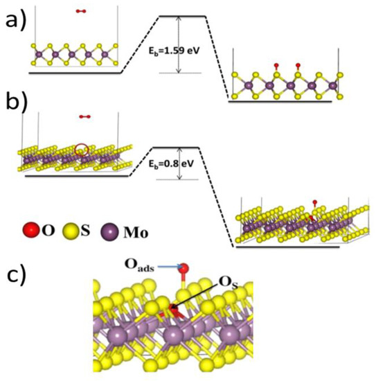 Regarding engaging into a chemical reaction, the O2 molecules, in contrast to molecular oxygen, have been computationally shown to be non-reactive towards the S atoms. A high kinetic activation energy barrier of 1.59 eV was obtained for dissociative adsorption of the O2 molecule on 1 ML thick MoS2 (see Figure 13a). Dissociative oxygen adsorption leads to adsorbed oxygen atoms in the form of two stable oxygen-terminated sulfurs. This can be considered already oxidation or a step leading to Mo oxides in the meaning of Equations (1)–(4). It is denoted here as follows: